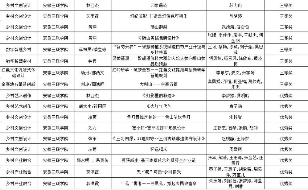 近日,2025年安徽省乡村振兴创新创业大赛评选结果正式揭晓。安徽三联学院学子在此次大赛中表现优异,共斩获34项奖项,其中一等奖3项、二等奖4项、三等奖18项、优秀奖9项,充分彰显了学校在服务乡村振兴战略中的创新育人成效。